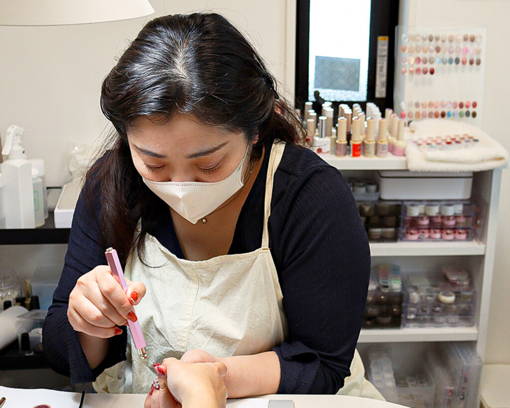 爪のお悩みやデザインのご希望などを伺います。デザインなど迷われている方も、お気軽にご相談ください。